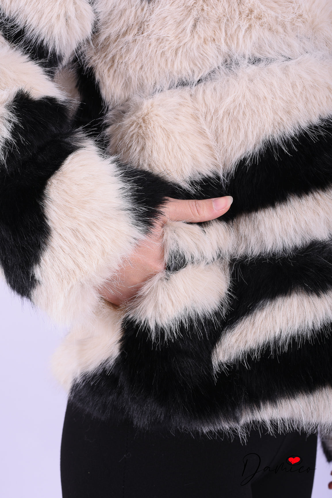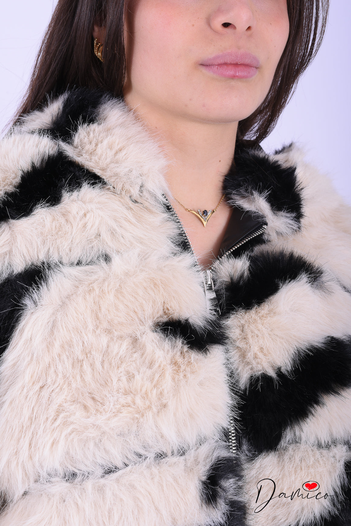 Pelliccia striata chiusa da zip sul davanti e con cappuccio